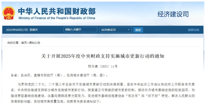 近日,財(cái)政部、住房城鄉(xiāng)建設(shè)部發(fā)布《關(guān)于開展2025年度中央財(cái)政支持實(shí)施城市更新行動(dòng)的通知》。